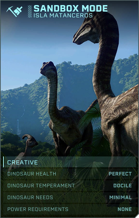 Sandbox mode is a game mode in the jurassic world evolution series which allows players to create a park on any island with the ability to toggle a variety of settings that are otherwise available in the main campaign or challenge mode.
